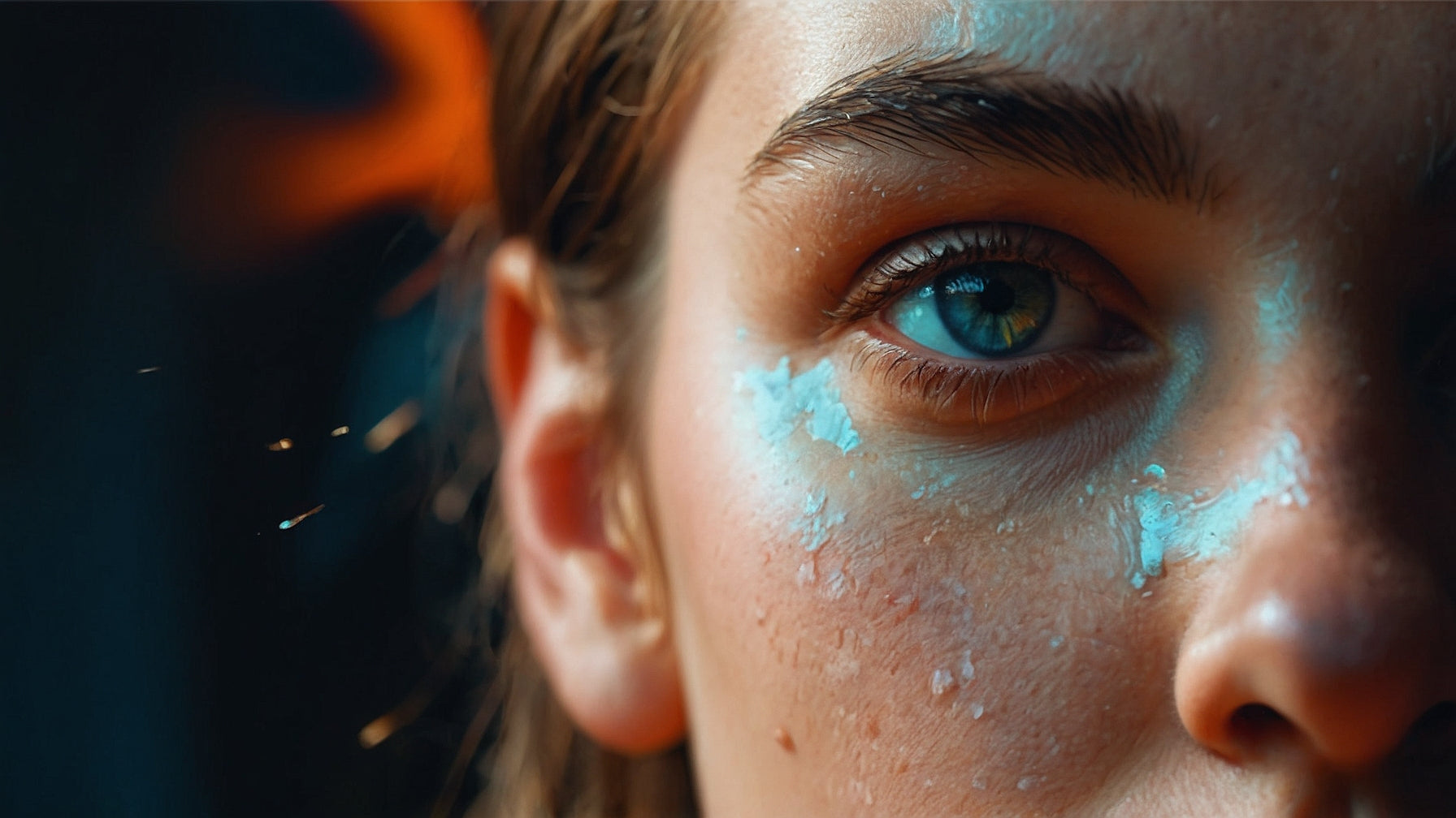 Dieses eindrucksvolle Bild zeigt eine Nahaufnahme eines menschlichen Auges, das durch die detaillierte Darstellung eine tief emotionale Wirkung erzeugt. Der Fokus liegt auf dem Auge, das in lebendigen Blau- und Grüntönen erstrahlt und dadurch eine intensive Ausdruckskraft besitzt. Die Haut um das Auge herum weist natürliche Texturen und Details auf, die durch ein sanftes, diffuses Licht hervorgehoben werden. Besonders auffällig ist die feine Schicht von pastellfarbenen Pigmenten auf der Haut, die einen künstlerischen Akzent setzt und dem Bild eine zusätzliche Dimension verleiht.