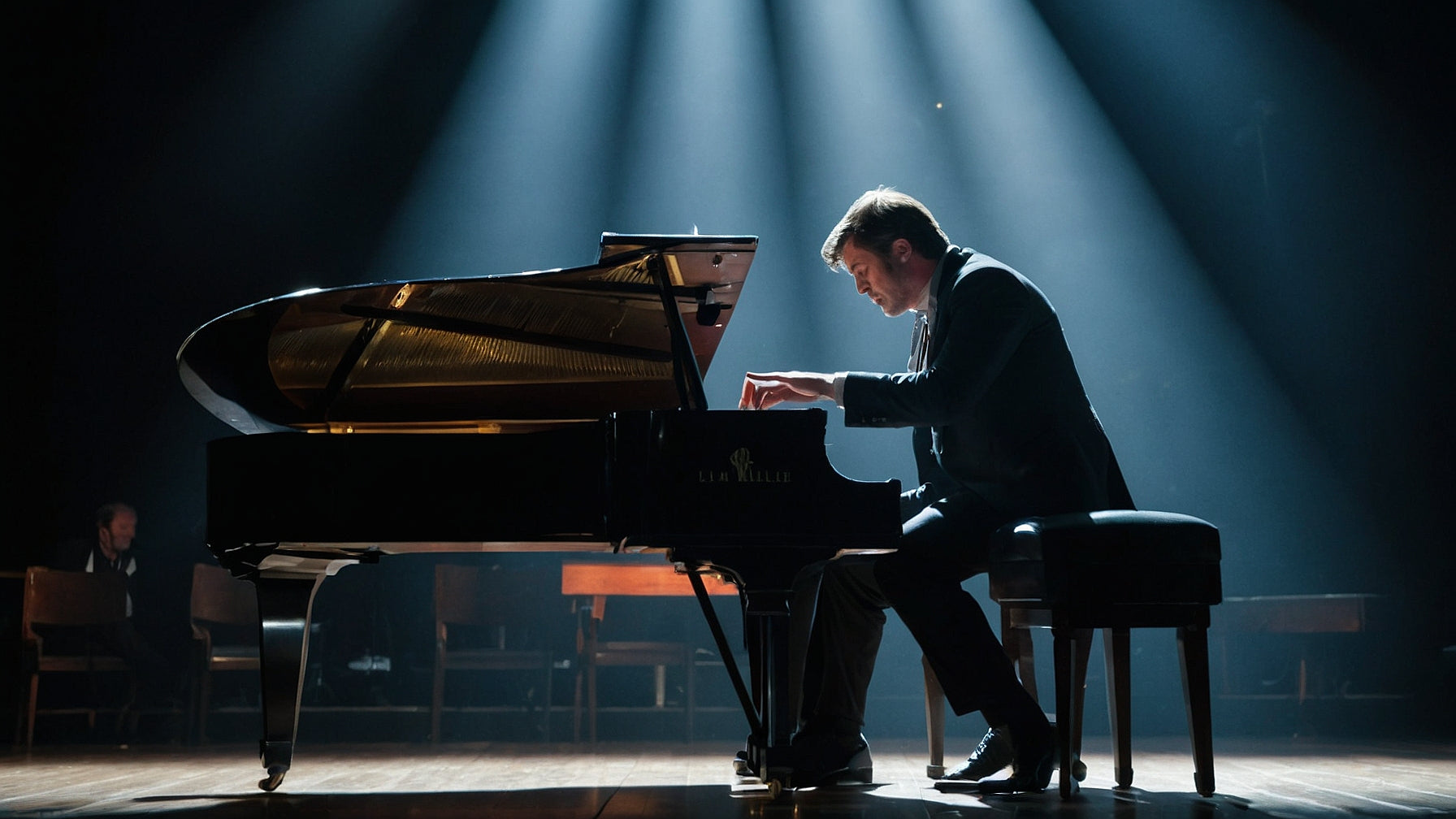 Der Pianist selbst ist tief in die Musik vertieft, seine Finger gleiten präzise über die Tasten, während sein Gesichtsausdruck völlige Hingabe und Leidenschaft widerspiegelt. Die Schatten und das Lichtspiel, das durch den gezielten Einsatz des Spotlights entsteht, erzeugen eine dramatische und zugleich intime Atmosphäre, die den Betrachter in den Bann zieht. Es ist, als würde man selbst im Publikum sitzen und diesem bewegenden Moment beiwohnen.