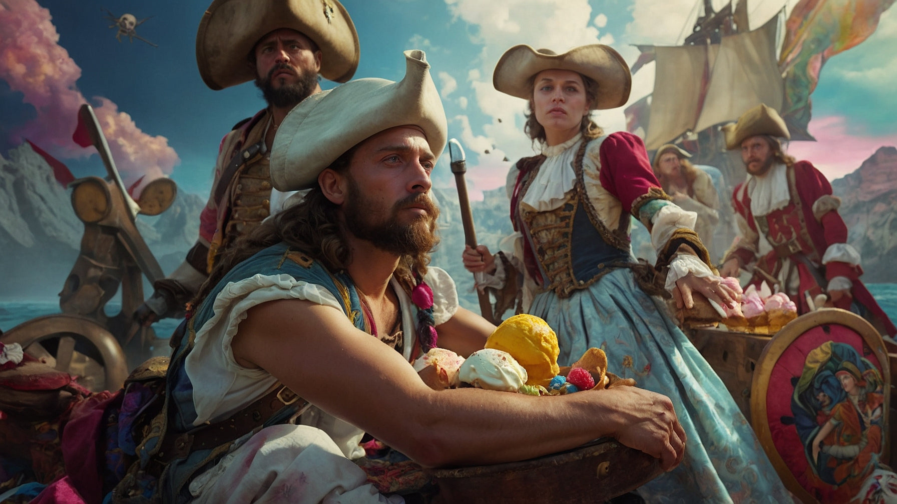 Besonders hervorstechend ist die Anordnung von buntem Eis, das von den Figuren mit größter Sorgfalt und fast religiöser Verehrung getragen wird. Diese farbenfrohen Desserts, die in einem auffälligen Kontrast zu der sonst ernsten Stimmung stehen, verleihen dem Bild eine surreale und fast humorvolle Note. Es ist, als ob die Piraten auf einer Mission wären, dieses kostbare Gut über die stürmischen Meere zu transportieren – ein Symbol für Genuss und Lebensfreude inmitten von Abenteuer und Gefahr.