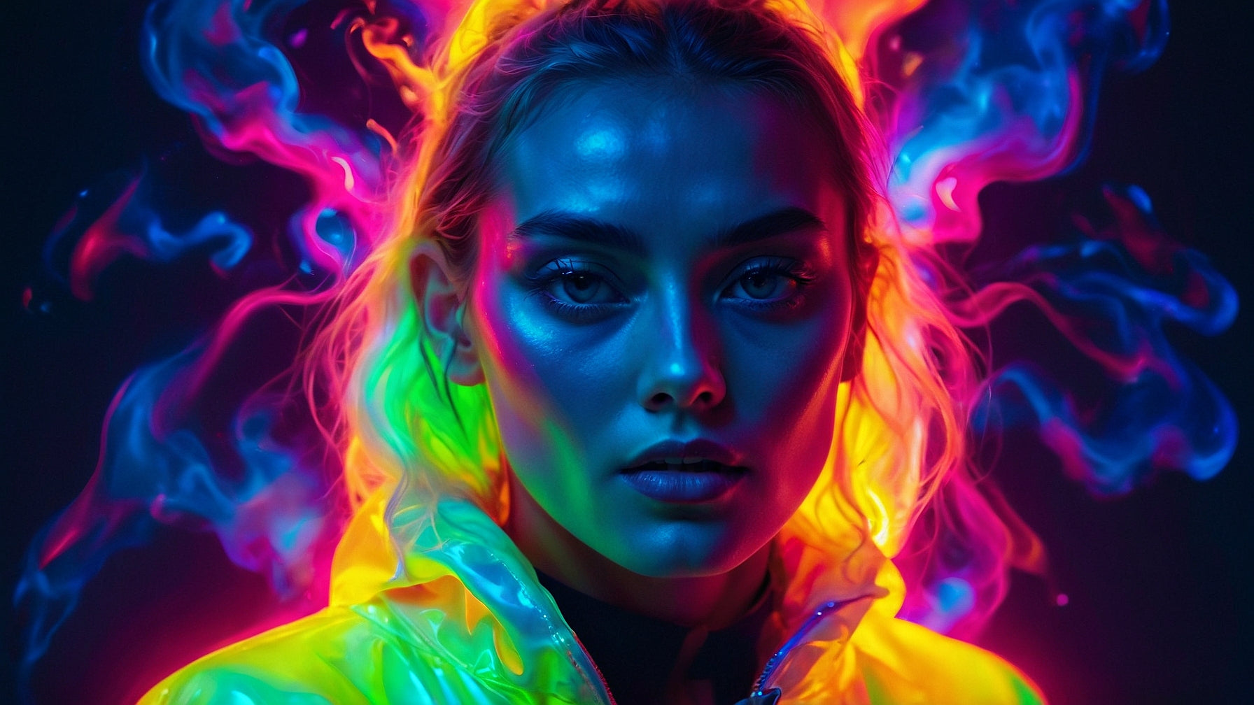 Dieses eindrucksvolle Bild fängt die Essenz moderner Kunst und Popkultur in einem atemberaubenden Porträt ein, das die Grenzen zwischen Realität und Fantasie verschwimmen lässt. Im Mittelpunkt steht das Gesicht einer Frau, deren Haut in einem spektakulären Farbenspiel leuchtet, als würde sie von innen heraus strahlen. Die intensiven, neonartigen Farben in Blau, Pink, Gelb und Grün erzeugen einen hypnotisierenden Effekt, der die Aufmerksamkeit des Betrachters sofort auf sich zieht.